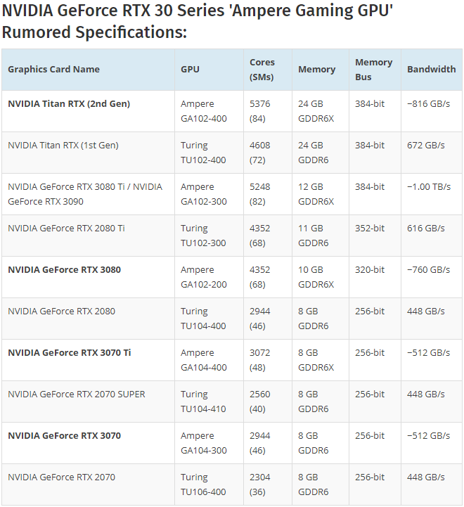 此外有传闻称,RTX 3070 Ti 具有与 RTX 2080 SUPER 相同的 CUDA 核心数,且 RTX 3070 也具有与 RTX 2080 相同的 CUDA 核心数。