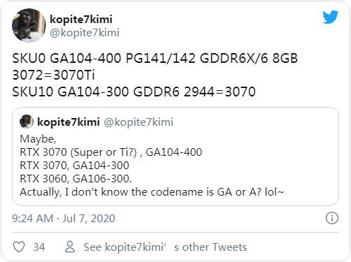 有趣的是,虽然传闻中提到了 GeForce RTX 3070 Ti,但 RTX 2070 时代却没有带“Ti”后缀的产品(而是 s 或 SUPER),直到再往前推到 GeForce GTX 1070 Ti 。