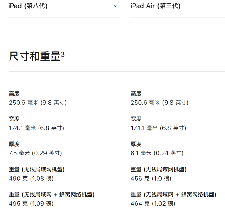 在尺寸和重量上,Air3屏幕稍大但反而比iPad 8要更轻薄一些。电池是Air3也偏小,不过都是30Wh左右,实际续航表现差距不大。