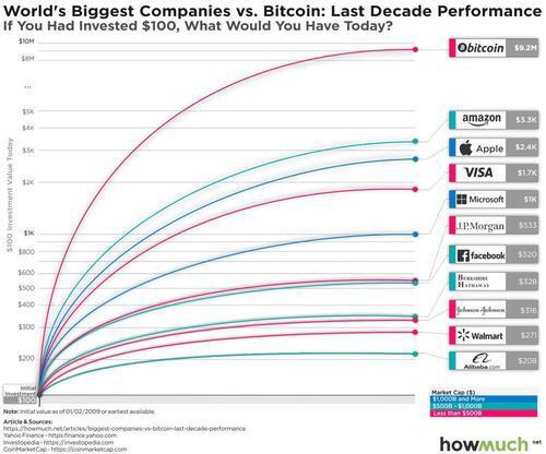 比特币 vs 全球最大企业 过去十年的表现