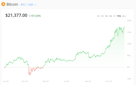 临近年尾,比特币迎来了一波强势涨幅。12月16日周三盘前,比特币史上首次突破2万美元关口。美股盘后,比特币继续飙涨,强势突破2.1万美元大关,日内涨幅日内大涨10%。根据Bitstamp平台,过去一个月,比特币价格已累计上涨近30%;今年以来的涨幅更是达到了200%。