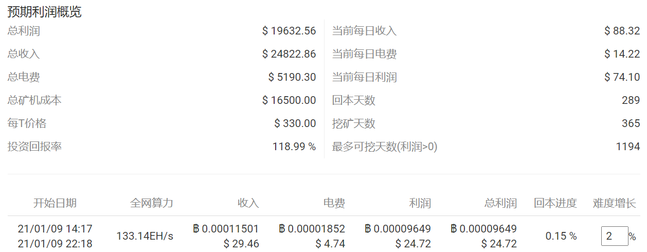 △受制于算法和网络结构,比特币的发现将越来越难,每发现一枚比特币所需要的计算机算力以及时间也将越来越高。上图为北京时间2021年1月9日14时左右进行比特币挖掘所需要的成本。目前,得益于比特币价值的不断提高,挖掘比特币已经成为了一项专门产业(图片来源:BTC.com)