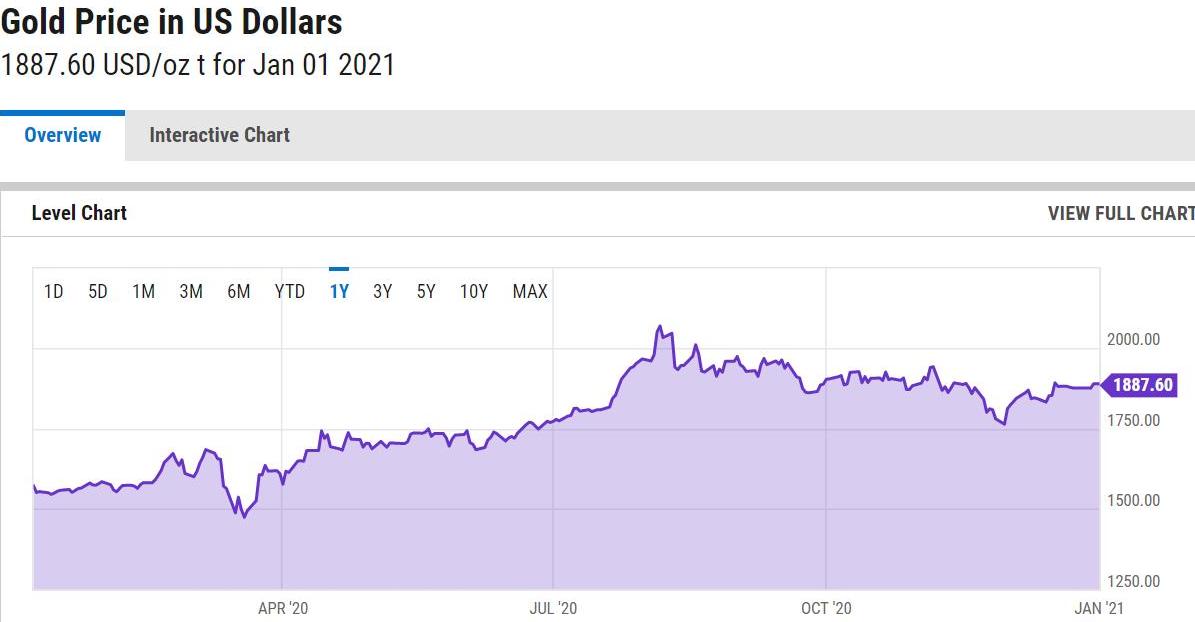 △2020年1月8日至2021年1月8日,黄金价格曲线图。除2月下旬至3月下旬,黄金价格波动下跌外,黄金价格在近一年都处于高位。2020年8月6日时,达到最高点,为2067.2美元/盎司。(数据来源:YCHARTS网站)