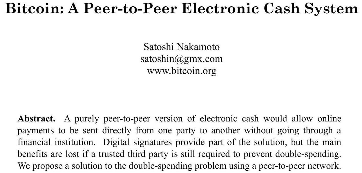 △中本聪(Satoshi Nakamoto)发表的文章《比特币:一种点对点的电子现金系统》(Bitcoin: A Peer-to-Peer Electronic Cash System)(图片来源于网络)