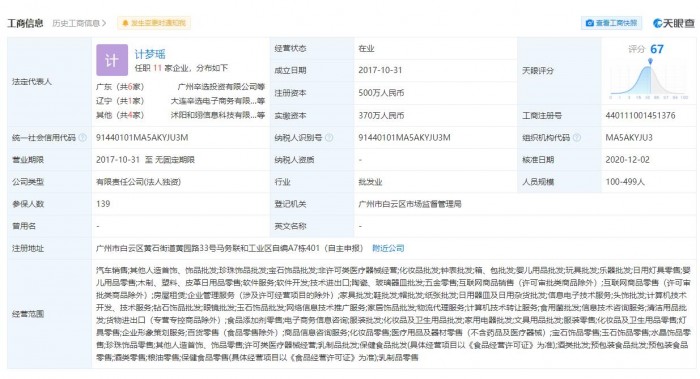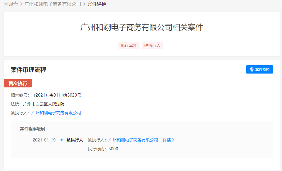 1月21日消息,天眼查显示,广州和翊电子商务有限公司因未按时履行法律义务被法院强制执行,执行法院为广州市白云区人民法院,立案时间为2021年1月19日,执行标的为5000元。据悉,辛有志持有该公司94.05%股份,为该公司实际控制人、最终受益人。