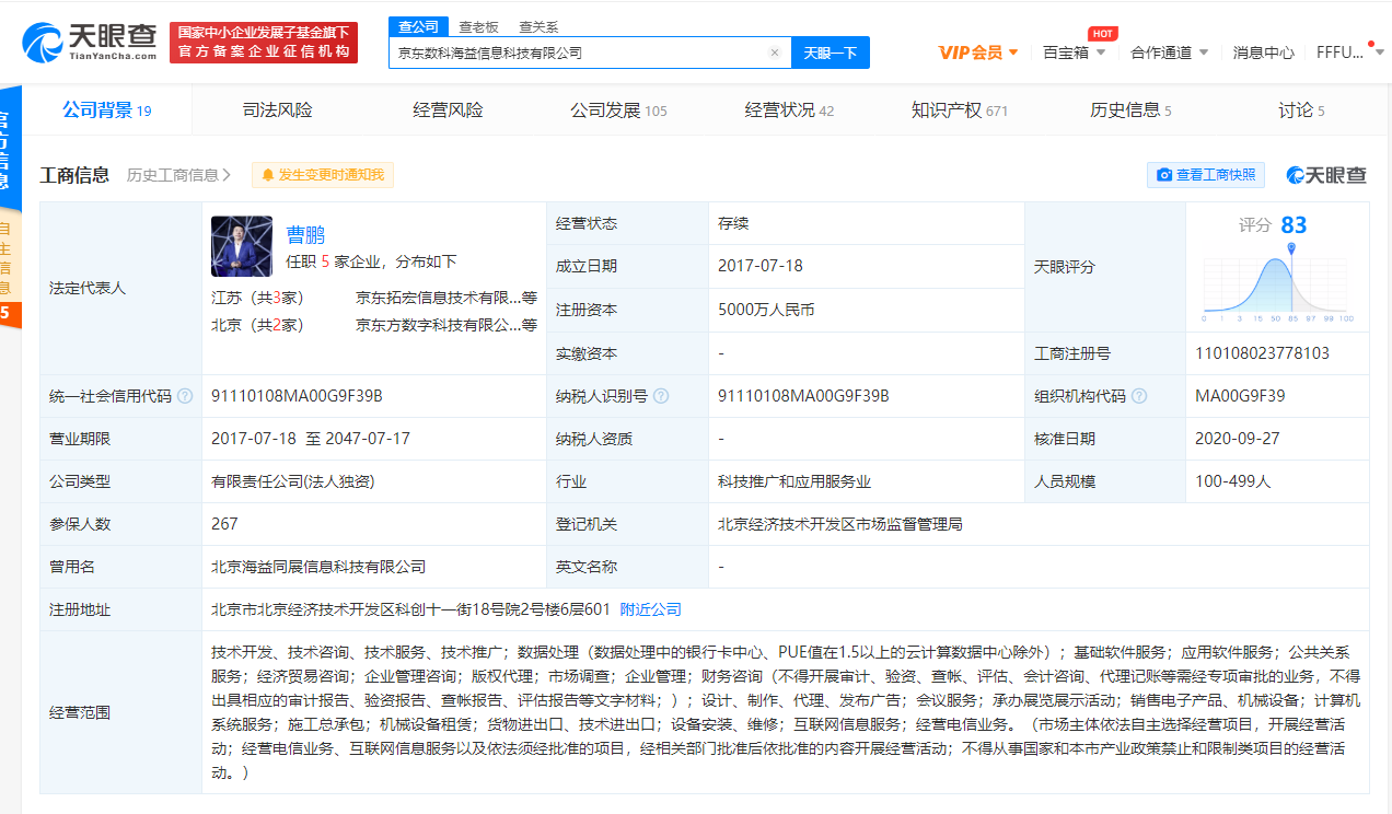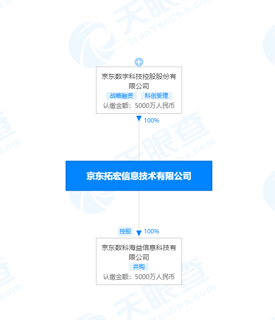 天眼查App显示,京东数科海益信息科技有限公司成立于2017年7月,注册资本5000万人民币,公司法定代表人为曹鹏,公司经营范围技术开发、技术咨询、技术服务、技术推广、数据处理等。该公司股权信息显示,京东数科海益信息科技有限公司由京东数字科技控股股份有限公司间接持股。