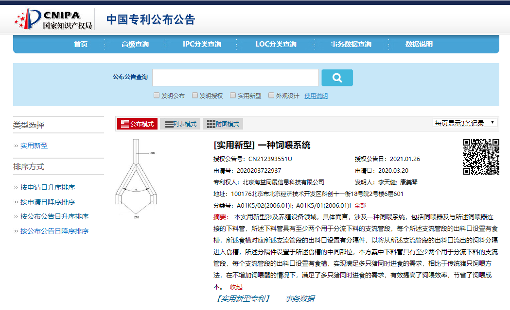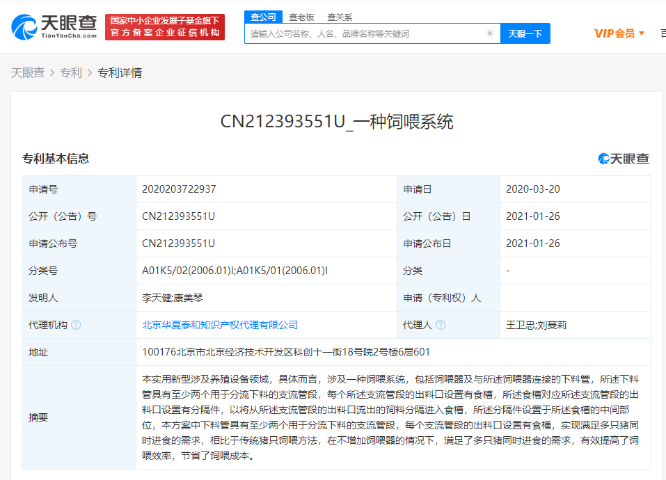 1月27日消息,天眼查App显示,京东关联公司京东数科海益信息科技有限公司公布一个涉及养猪饲料投喂系统的新专利。专利名称为“一种饲喂系统”,专利公开号CN212393551U,专利公开日期为2021年1月26日。