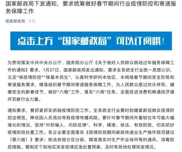 1月28日午间消息,为贯彻落实中共中央办公厅、国务院办公厅《关于做好人民群众就地过年服务保障工作的通知》要求,1月27日,国家邮政局发出通知,要求全系统全行业统一思想认识,立足“保疫情防控”“保基本民生”,认真科学研判本地区、本网络春节期间安全形势和寄递服务需求,精准组织春节期间寄递服务保障工作,为人民群众度过欢乐祥和、健康安全的新春佳节,做好“六稳”工作、落实“六保”任务,全面促进消费和畅通经济循环贡献行业力量。