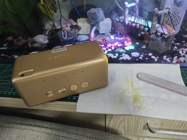 网友用挫刀搓掉“金砖版”音箱的外壳材质来“验金”