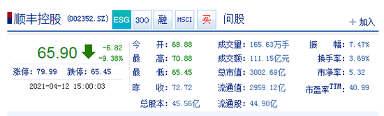 今日,顺丰控股再度跌停,股价报65.90元/股,两天市值蒸发近670亿元。截至收盘,顺丰控股跌幅9.38%,成交金额超111亿元,创出历史新高。上周五,顺丰控股一字跌停。至此,顺丰控股两天市值蒸发约700亿元。