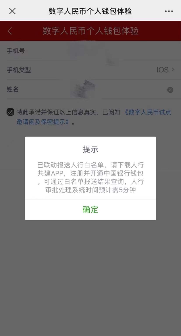 在实际操作中,在未通过银行扫码开设流程的情况下,数字人民币(试点版)App并不能直接开户,开设钱包仍需要“白名单”的认证过程。