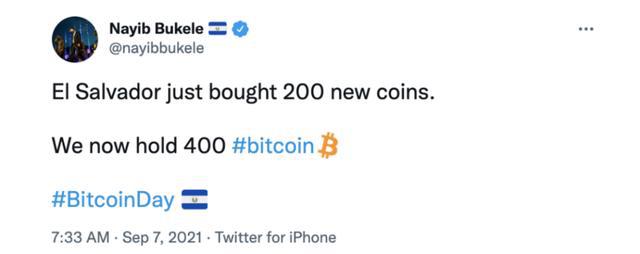 萨尔瓦多议会于2021年6月9日通过一项法案,批准将比特币作为本国法定货币。萨尔瓦多总统纳伊布·布克尔当日也在社交媒体宣布,该国政府已经购买了400枚比特币。以该推文发布时的比特币价格计算,萨尔多瓦购买的虚拟货币总额约为2090万美元。