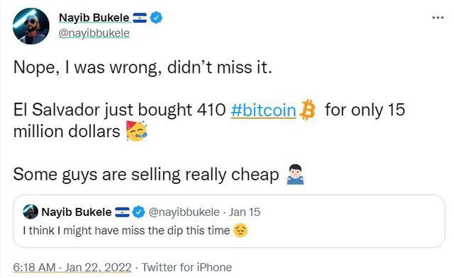1月22日,中美洲国家萨尔瓦多总统伊布·布克尔在社交媒体上表示,萨尔瓦多已逢低买入410枚比特币。