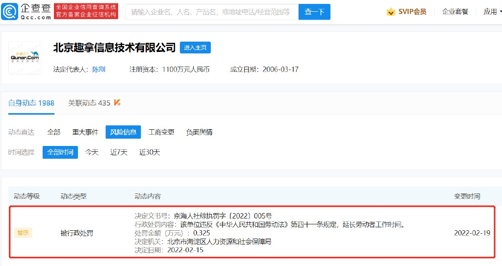 2月21日消息,企查查APP显示,近日,去哪儿网关联公司北京趣拿信息技术有限公司因延长劳动者工作时间被行政处罚。相关信息显示,处罚事由为该单位违反《中华人民共和国劳动法》第四十一条规定,延长劳动者工作时间,处罚结果为对该单位给予警告,并处3250元罚款,处罚单位为北京市海淀区人力资源和社会保障局。