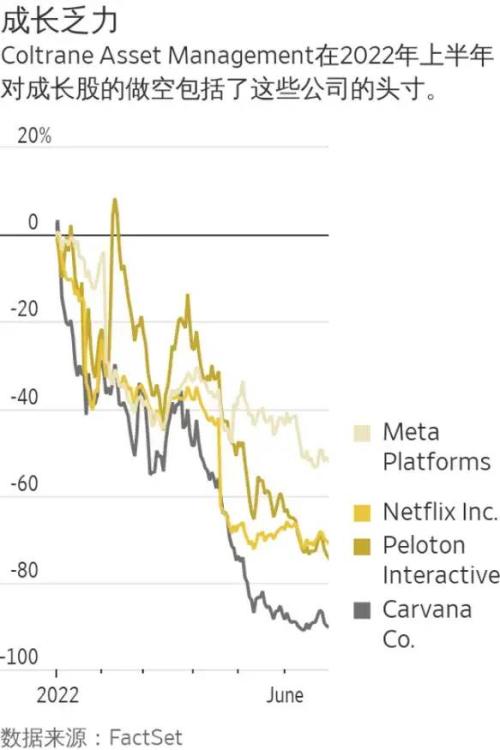 在专注于成长股的对冲基金纷纷录得巨额亏损、企业估值大幅下降之际,Coltrane实现了上涨。疫情期间的宠儿Netflix(220.44, -3.44, -1.54%) Inc. (NFLX)和Peloton Interactive Inc. (PTON)的股价下跌功不可没,做空Meta Platforms Inc. (FB)、电子游戏平台Roblox(39.4, -2.52, -6.01%) Corp. (RBLX)和电动卡车制造商Rivian Automotive Inc. (RIVN)也带来贡献。一位知情人士说,做空二手车网站Carvana Co. (CVNA)为该基金贡献了9个百分点的涨幅。该网站的股价今年迄今为止暴跌约90%。