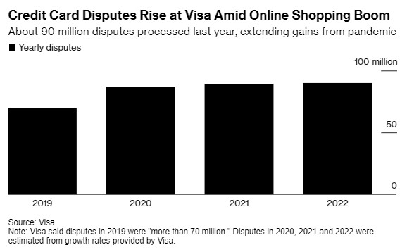 尽管如今防护软件不断普及,但随着欺诈行为与电子商务和通货膨胀一起增长,Visa(V.US)的信用卡纠纷案件数量在疫情后持续上升。这家支付公司提供的数据显示,2022年,Visa网络上的纠纷增加到9000多万起。相比之下,2019年提交的纠纷案件超过7000万起,2020年疫情期间增加了24%,2021年和2022年每年增加约2%。