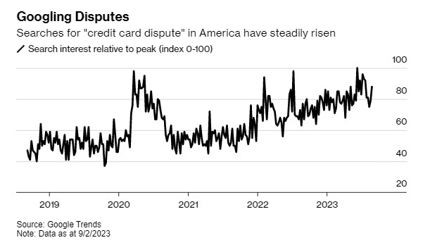 纠纷的增加被广泛归因于自新冠疫情爆发以来持续向网上购物的转变,在较小程度上归因于通胀的加剧。包括沃尔玛(WMT.US)等巨头在内的一些零售商甚至建议客户使用信用卡纠纷系统来解决退款纠纷事件,而不是在公司内部处理。自2019年以来,“信用卡纠纷”在谷歌搜索的次数也有所上升。