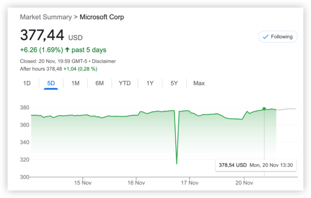 微软周一最终收涨2%,完全收复了因宫斗产生的损失,创下历史新高,盘后股价还在继续涨。