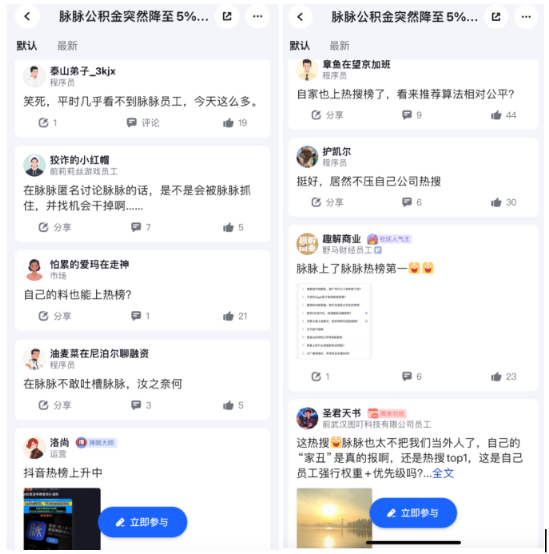 脉脉取消部分福利的话题一经出现,就激发脉脉员工纷纷参与讨论,直接空降热榜前列。而在发酵一两天后,引发更多职场人参与,纷纷调侃“竟然能在脉脉上吃到脉脉的瓜”,新一轮讨论更是直接将话题送上热榜第一。