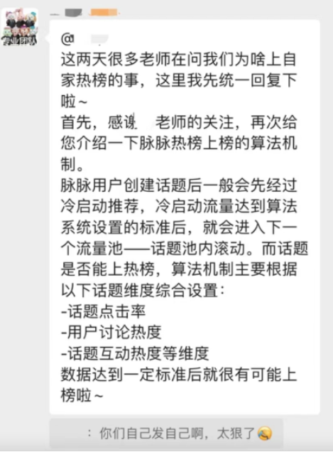 有媒体在群内询问此事,脉脉相关人士回应称,脉脉用户创建话题后一般会先经过冷启动推荐,再经过多轮的算法推荐,最终上榜。言外之意,脉脉的榜单全靠算法,没有人为干涉。但这尚未消除外界的怀疑。