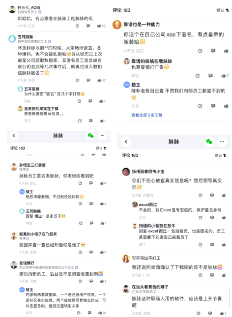 不少网友好奇脉脉员工为什么敢这么明目张胆在自家平台吐槽自家公司,不怕被查到身份被谈话被报复吗?毕竟此前拼多多开除过发帖爆料猝死事件的员工,比特大陆开除发帖曝光拖欠工资的员工。企业管理内部舆情的方式无外乎用安装各种工具监控员工言行,锁定“不老实”的员工,后续约谈、打低绩效、开除都是常规操作。故而引发了用户对脉脉是否匿名的疑虑。