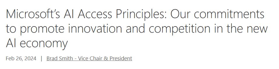 在反垄断审查方面,微软似乎又在避嫌了,试图澄清它与OpenAI的深度合作并非有阻碍竞争之嫌。继微软与法国人工智能初创公司Mistral AI进行投资合作之后,微软总裁布拉德·史密斯(Brad Smith)宣布了一套促进人工智能领域创新与竞争的原则。