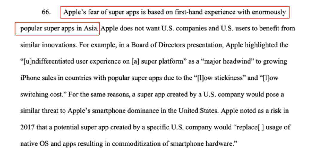甚至,美国司法部也直接在诉状中称,苹果对超级应用的恐惧是基于它“对亚洲非常受欢迎的超级应用的一手经验”。