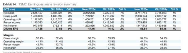 同时,鉴于苹果占据了台积电20%至25%的收入,大摩小幅上调了对台积电2025年和2026年的收入预期,幅度在1%-2%之间。