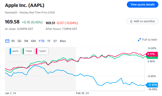 一组对比显示,苹果股价目前已从去年12月份的最高点198.11美元下跌了14%,而同期标普500指数则上涨了10%,纳斯达克100指数上涨了近9%。