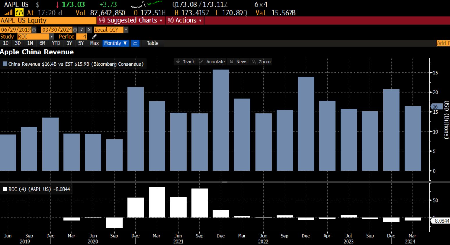 分区域来看,苹果第二财季在其第三大市场——大中华区的营收为163.72亿美元,尽管与去年同期的178.12亿美元相比大幅下降8%,但要优好于市场预期的两位数百分比降幅。在财报发布前,华尔街曾悲观地认为这一数字可能同比下降11%至158.7亿美元。