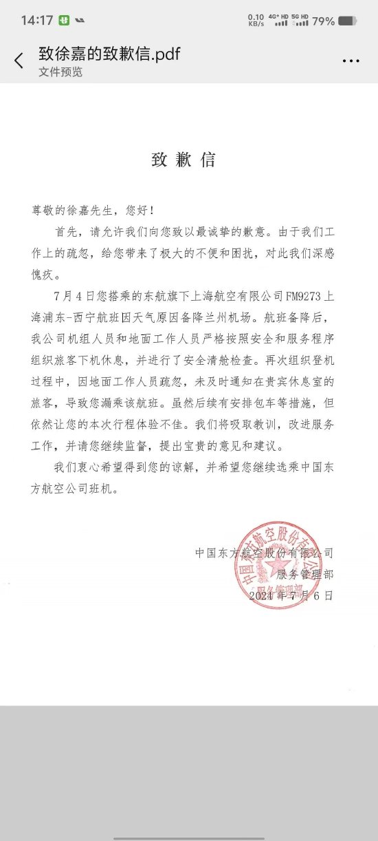 7月7日下午,事件当事人之一,微博博主春卷表示,已收到来自“中国东方航空公司服务管理部”的书面道歉函,东航在该书面道歉函中表示: