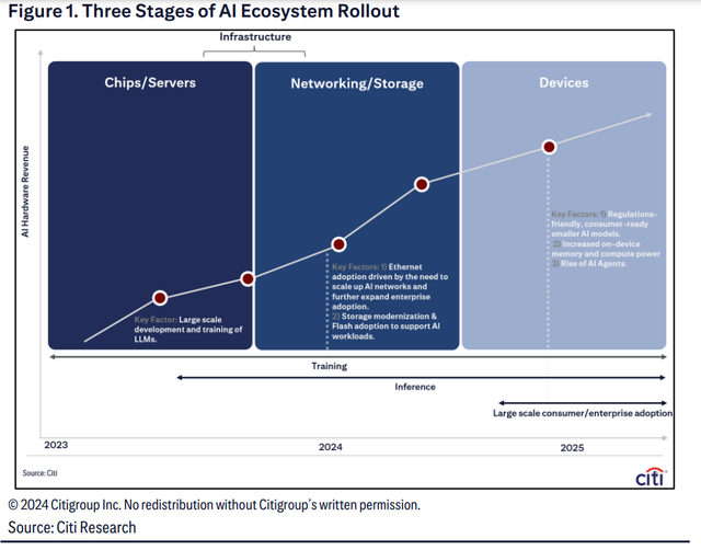 尽管英伟达在AI基础设施阶段独占鳌头,但AI技术向设备功能转变的时机似乎已经到来。花旗认为,随着“Apple Intelligence”的推出,苹果将在AI设备时代大放异彩。