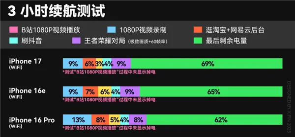 有人说,ProMotion 的屏幕比固定刷新率的屏幕省电,所以为了验证这块动态刷新率的屏幕是不是更加省电,我们也跑了一个三小时续航测试,图片上的所有项目分别跑了半小时之后,剩余电量 69% ,比 iPhone 16e ( 剩余 65% )、iPhone 16 Pro ( 剩余 62% )的续航表现都要好。