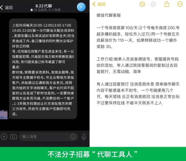 微信安全中心近日发布提醒称,根据用户投诉发现,有不法分子在外部平台发布“代聊招募”信息,组织所谓“代聊工具人”,以寻找宠物、车辆刮擦处理、相亲交友等为由主动添加微信好友,再以“误加好友”为借口展开搭讪。