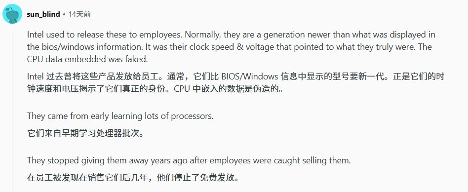 员工借用芯片比普通工程样品(ES)更为罕见,其稀有性可能还受到严格借用条款的影响,不过一位自称Intel“内部人士”的用户表示,由于公司大规模裁员,对借用系统的监管已经消失。