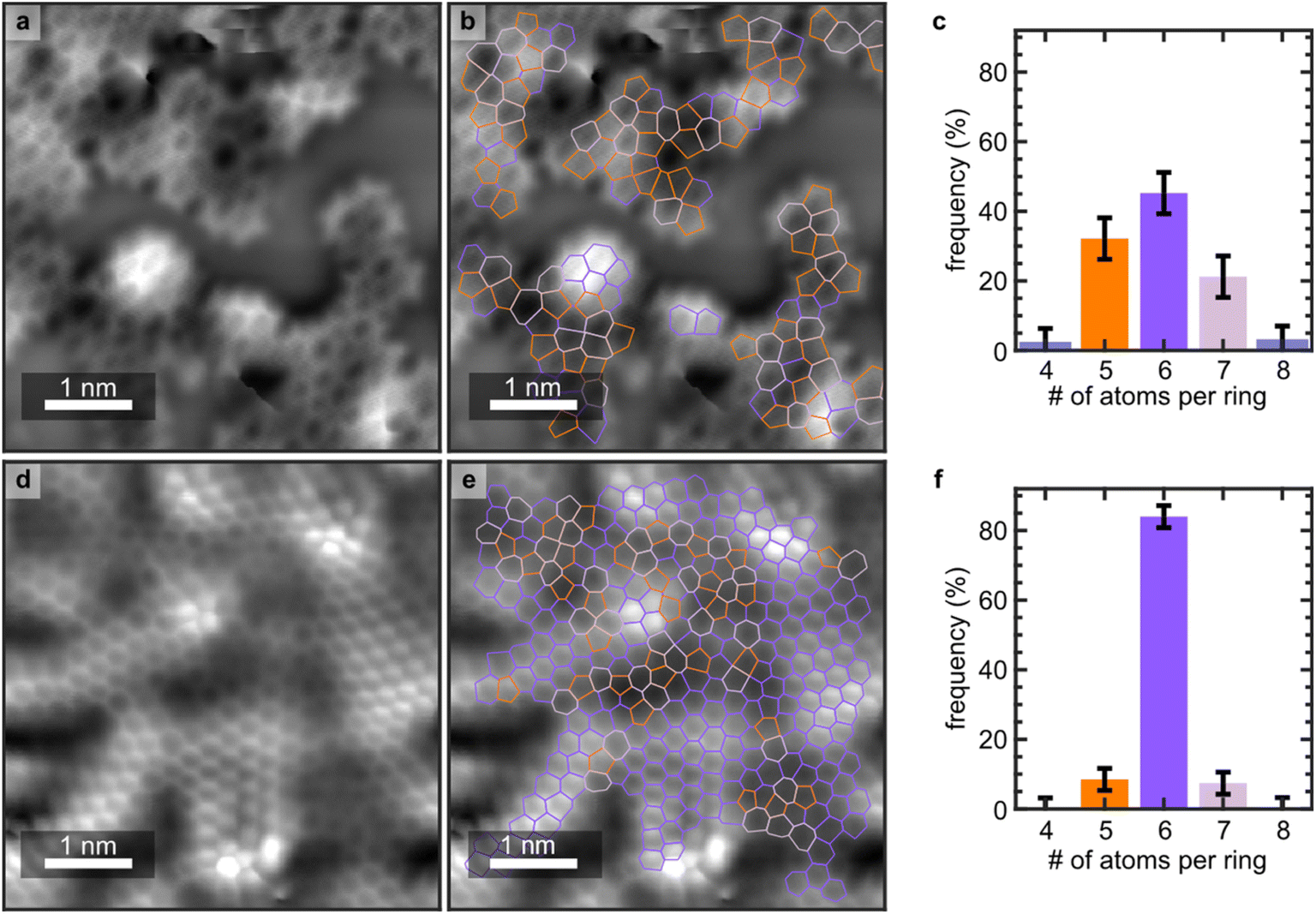 石墨烯的标准结构为六元碳环的二维网格,而本研究所用缺陷则引入具有五元和七元环的邻位结构。Azupyrene分子本身就拥有目标的环结构,为制备高缺陷密度的石墨烯薄膜提供了天然平台。同时,科学家还可通过调节制备温度来精细掌控缺陷数量。