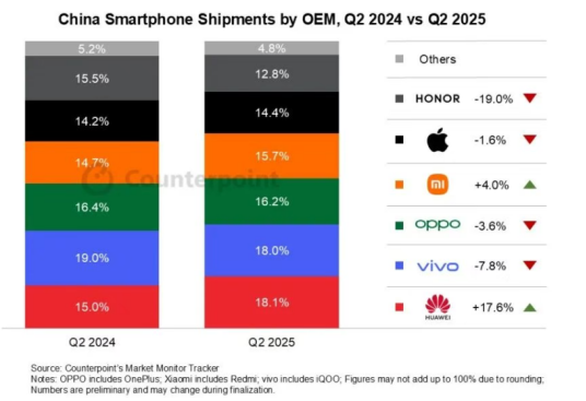 根据调研机构CounterPoint Research发布的最新报告,今年第二季度中国智能手机市场出货量前五名分别为华为、vivo、OPPO、小米和苹果,而荣耀则排名第六,出货量同比下降19%。这意味着荣耀要在今年重返国内市场前三,仍需努力。