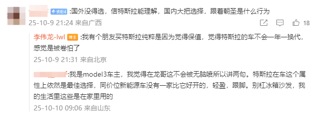 有车主坚称:“特斯拉在车这个属性上依然是最佳选择,同价位新能源车没有一家比它好开的,轻盈,跟脚。别杠冰箱沙发,我的生活里这些是在家里用的。”