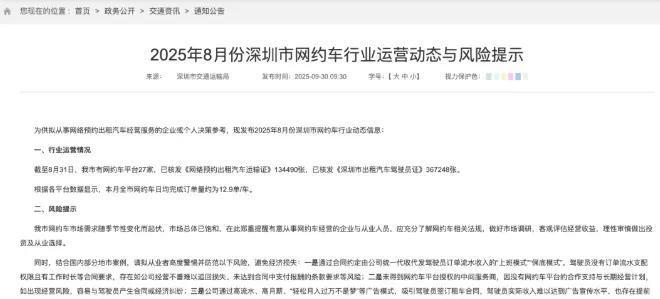 交通运输部数据显示,全国网约车平台公司已达385家,多地陆续发布运力饱和预警,行业供给过剩问题突出。以深圳市为例,2025年9月数据显示,当地有27家网约车平台,已核发《网络预约出租汽车运输证》134490张,《深圳市出租汽车驾驶员证》367248张,而网约车单车日均订单量仅约12.9单,日均营收较年初呈下降趋势。