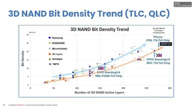 TechInsights展示了各大厂商在 3D NAND位密度(bit density) 上的演进趋势,横轴是堆叠层数,纵轴是单位面积的存储密度。可以看到,层数越高,代表技术越先进,也能带来更高的存储密度。