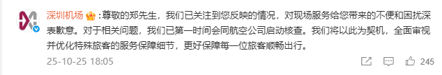 对此,深圳机场官方微博在留言区致歉:尊敬的郑先生,我们已关注到您反映的情况,对现场服务给您带来的不便和困扰深表歉意。