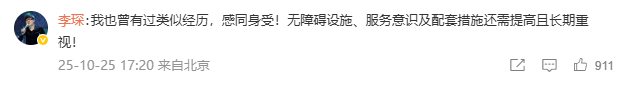 在郑智化这条微博的评论区,歌手李琛也表示:我也曾有过类似经历,感同身受!无障碍设施、服务意识及配套措施还需提高且长期重视!