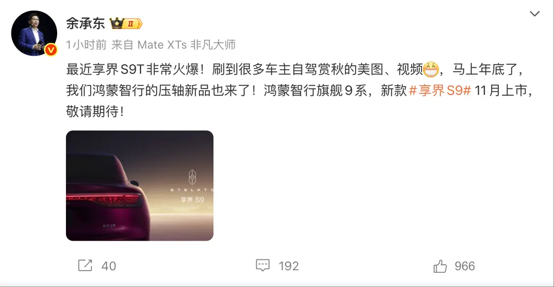 华为余承东官宣鸿蒙智行“压轴新品”:新款享界S9 11月上市