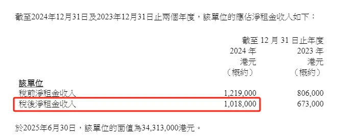 截至2025年6月末,标的物业估值为3431.3万港元,2024年度税后净租金收入101.8万港元,相较于2023年度的67.3万港元同比增幅达51%,当前处于空置状态。