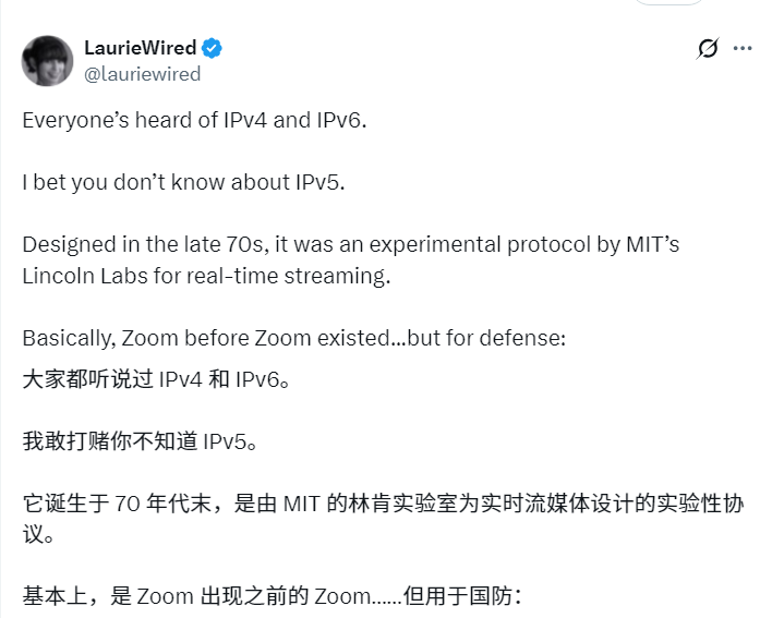 根据LaurieWired对互联网协议(IP)发展史的回顾,从IPv1到IPv3(设计于1973年至1978年间)都是实验版本,主要目标是定义互联网的寻址方式。