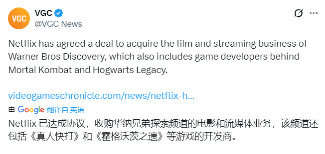 据VGC、IGN等多家外媒报道,网飞Netflix已与华纳兄弟达成最终协议,将以827亿美元收购该工作室,包括其电影与电视部门、流媒体平台HBO Max和HBO。此项交易还包括《真人快打》和《霍格沃茨之遗》等游戏背后的游戏开发团队(NetherRealm Studios、Avalanche Software、Rocksteady Studios、TT Games、华纳蒙特利尔工作室等)。