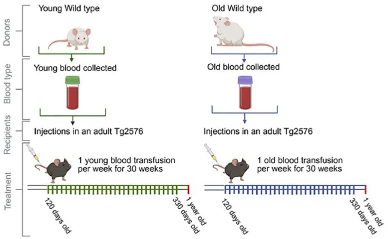为探究血液中与年龄相关的因子如何影响脑内病理,本研究采用在阿尔茨海默病研究中广泛使用的Tg2576转基因小鼠模型。 研究人员在约30周内,每周为这些小鼠输注来自年轻或老年野生型小鼠的全血,以观察循环因子是否会改变脑内淀粉样斑块负荷及行为表现。 供血小鼠分为两个年龄组:一组为50–75日龄的年轻鼠,另一组为443–532日龄的老年鼠,而接受输血的Tg2576小鼠在120日龄时开始干预,随后持续输血至约一年龄时被处死以进行脑组织分析。