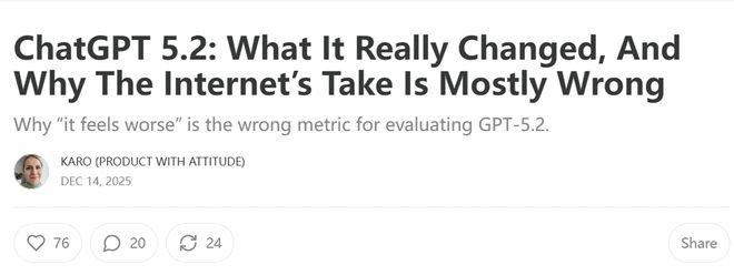 资深产品经理KARO指出,如果将GPT 5.2视为一个用于演示、追求“掌声”的模型,它可能会令人失望;但如果将GPT 5.2视为一个追求长期稳定性、需要实际部署的工具,它则超越了所有前辈。