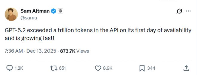 甚至当OpenAI CEO萨姆奥特曼(Sam Altman)透露 “GPT-5.2在API上线首日即突破万亿tokens使用量,且增长势头迅猛” 时,不少用户纷纷跟帖吐槽:“词符不等于情谊,指标不等于记忆”、“第一天就消耗了万亿Token,他们竟然还有脸欢呼雀跃”。