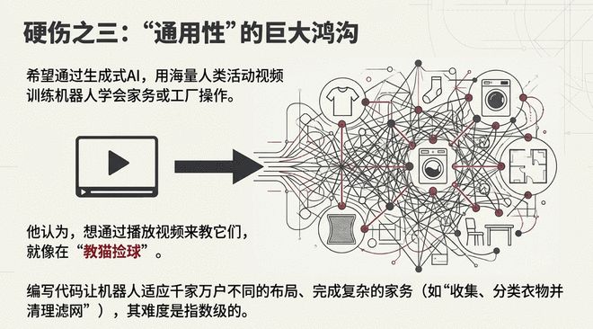 3. “通用性”的巨大鸿沟: 硅谷希望通过生成式AI,用海量人类活动视频训练神经网络,让机器人学会家务或工厂操作。演示视频看起来“令人印象深刻”,但布鲁克斯泼冷水称:想通过播放视频来教它们? 他认为,编写代码让机器人适应千家万户不同的布局、完成复杂的“收集、分类衣物并清理滤网”等家务,其难度是指数级的。